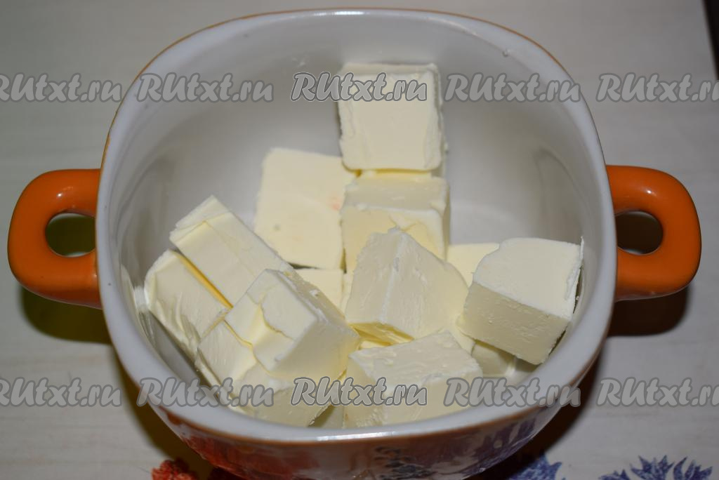 Сливочное масло нарежем на кубики и отправим в микроволновку на 30 секунд.