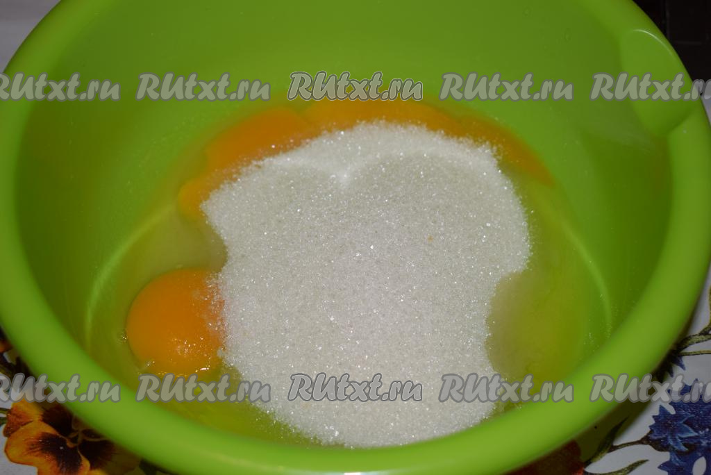 В глубокую миску вобьём яйца, добавим сахар и перемешаем при помощи вилки.