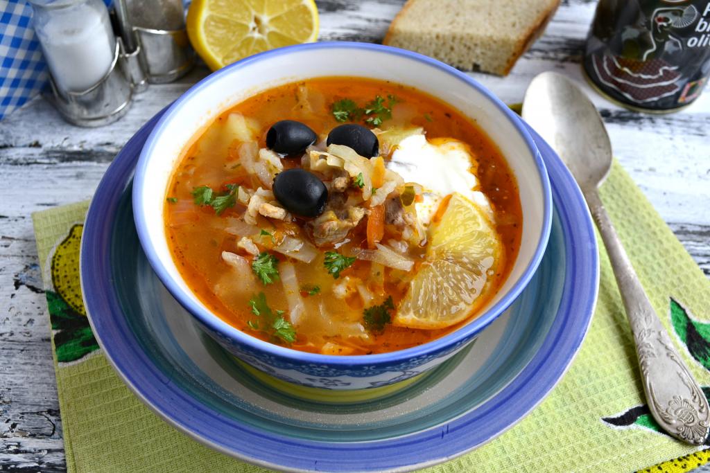 Вкусный, насыщенный, сытный рассольник, приготовленный с капустой и солеными огурцами, разлить по тарелкам, добавить сметану, дополнить оливками, лимоном и зеленью, подать к столу.