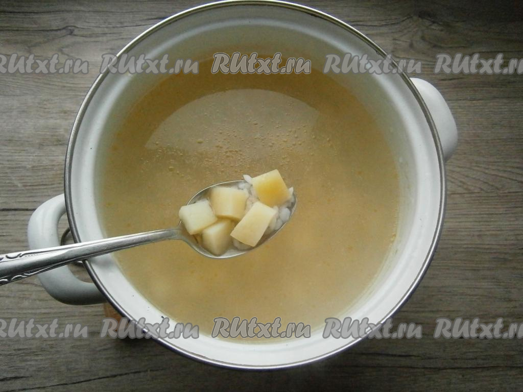 Картофель очистить и нарезать в кастрюлю небольшими кубиками.