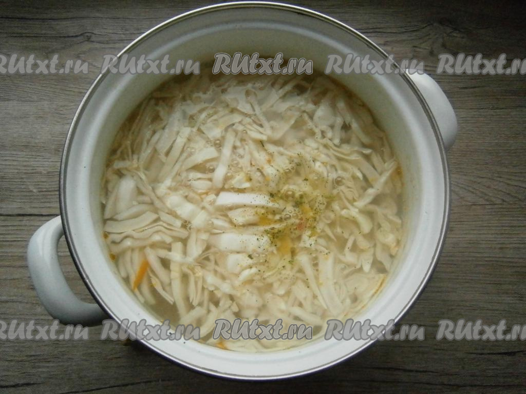 Когда картофель и рис будут почти готовы, добавить в кастрюлю нашинкованную капусту и приправу.