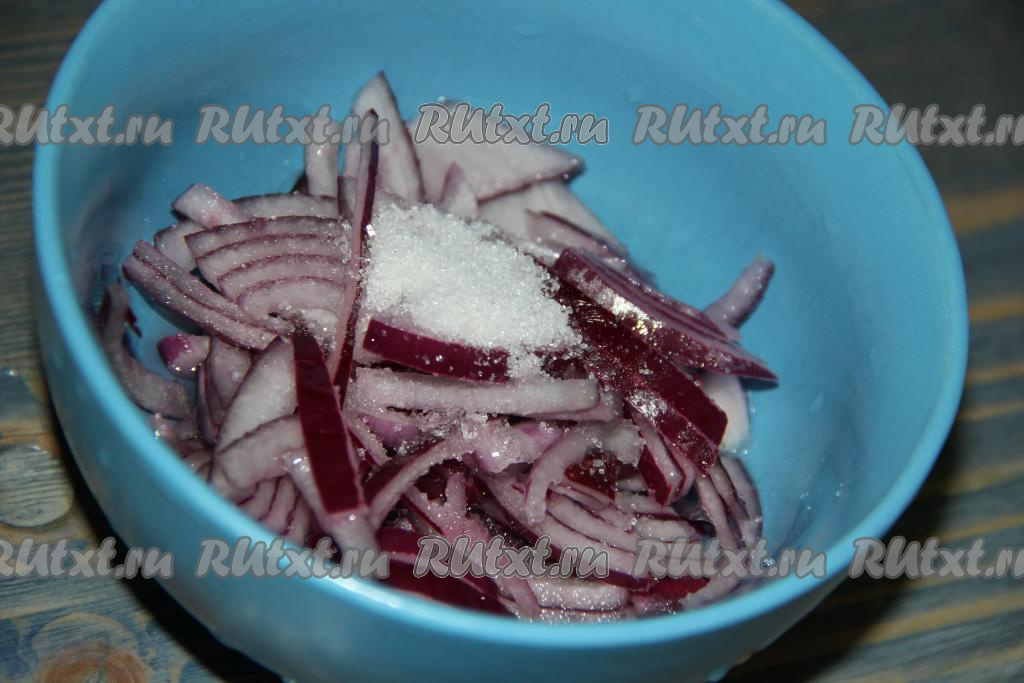 Лук очистить и замариновать в маринаде из двух столовых ложек воды, одной столовой ложки 9%-ного уксуса и щепотки сахара. Оставить лук в маринаде на 15-20 минут. По истечении времени маринованный лук выложить на дуршлаг, чтобы стек лишний маринад.