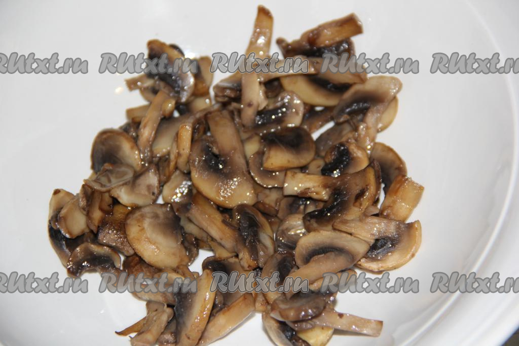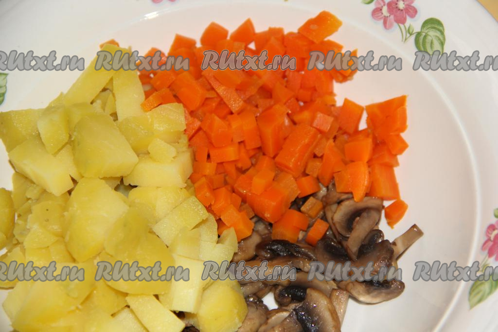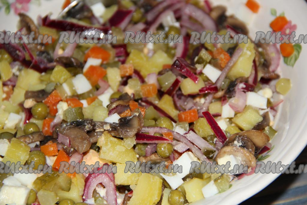 Картофель, морковь тщательно вымыть и, не очищая, сварить до готовности (готовые овощи будут легко прокалываться вилкой). Яйца отварить в течение минут 10 с момента закипания воды. Морковь, картошку и яйца остудить. Шампиньоны вымыть, нарезать на пластины и обжарить на растительном масле на среднем огне в течение 10-15 минут, не забывая периодически помешивать. Затем грибы остудить и выложить в салатник.