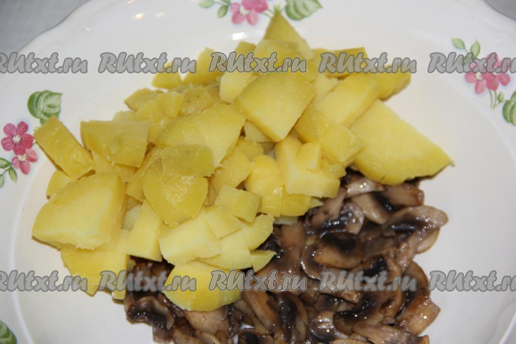 Вареный картофель очистить и, нарезав на кубики среднего размера, выложить в салатник с жареными шампиньонами.