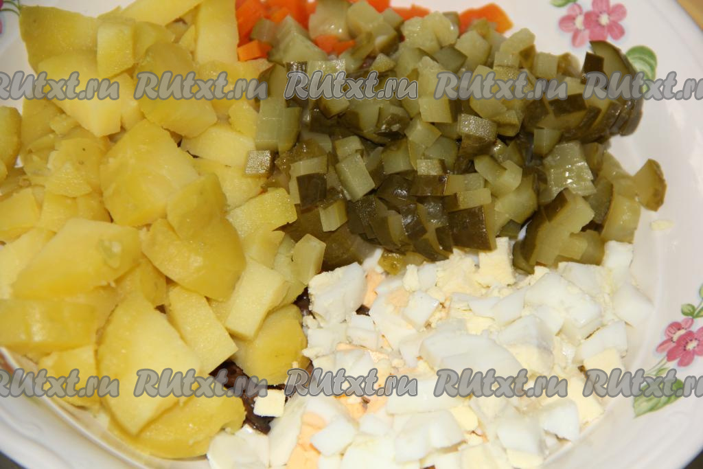 Соленые (или маринованные) огурчики нарезать на кубики среднего размера, выложить в салат.