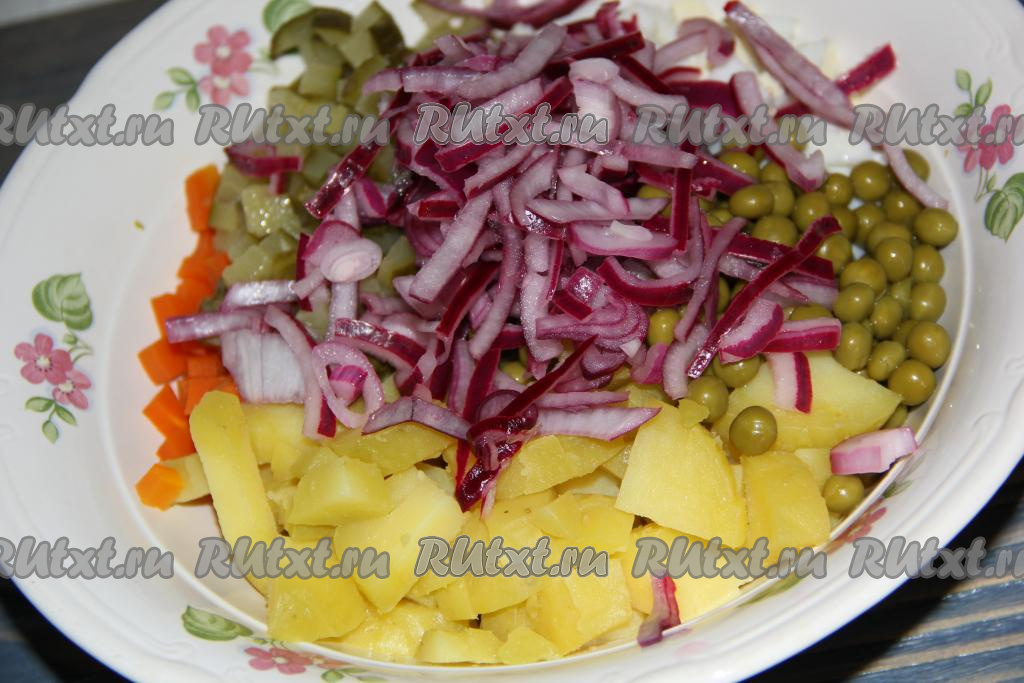 В салат добавить консервированный горошек (без жидкости) и маринованный лук.