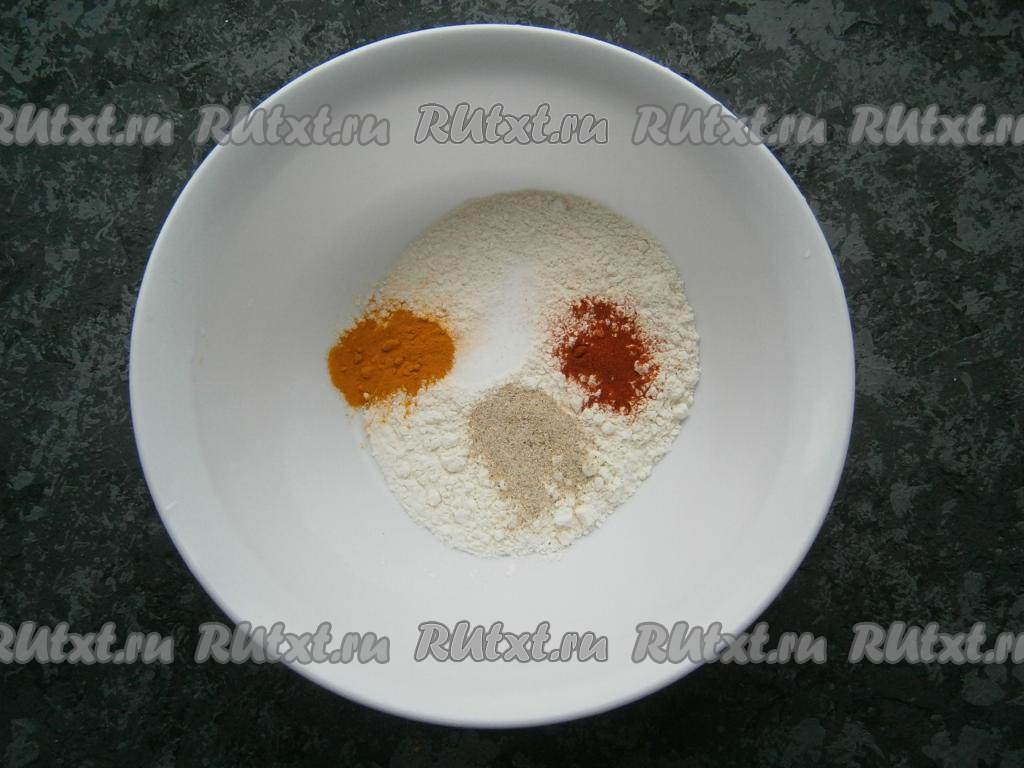В муку добавить паприку, сушеный чеснок (или чесночный перец), куркуму, 0,5 чайной ложки соли.