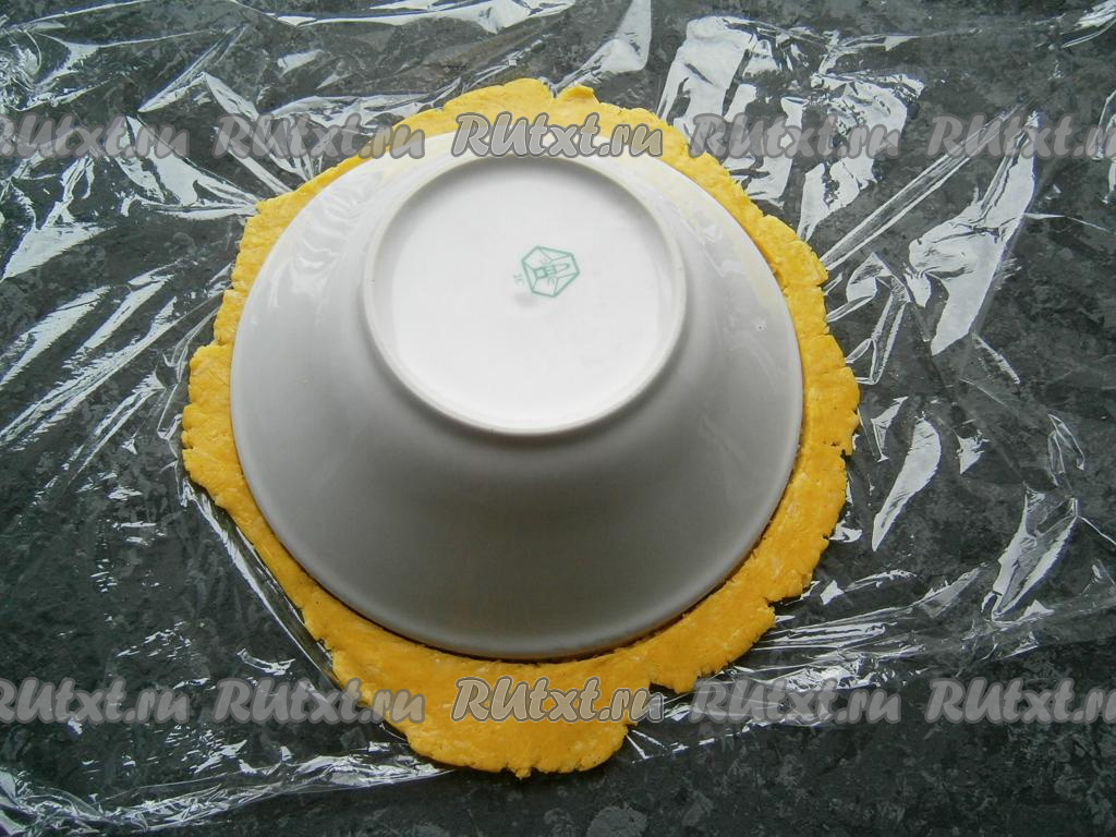 Верхнюю часть пленки снять, обрезать края лепешки с помощью тарелки или крышки от кастрюли.
