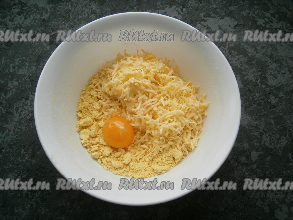 Добавить сырой желток и натертый на мелкой (или средней) терке сыр.