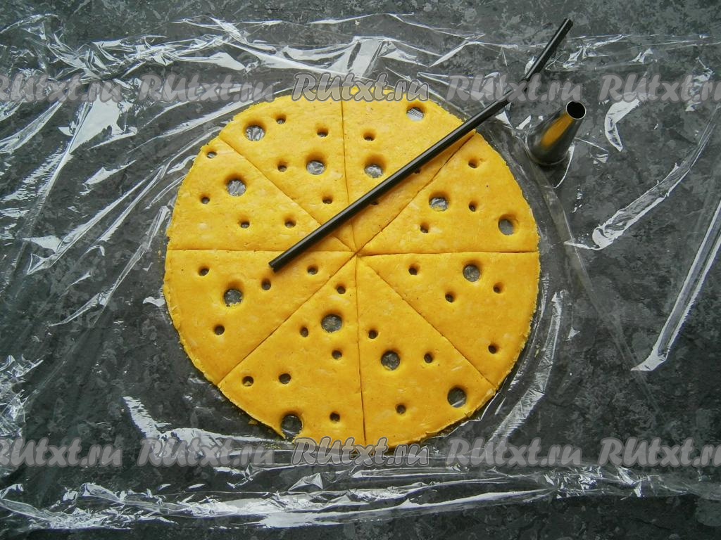 Разрезать лепешку на 8 частей (как для рогаликов) и сделать в тесте дырочки разного диаметра (я сделала дырочки с помощью коктейльной трубочки и круглой насадки для тортов).
