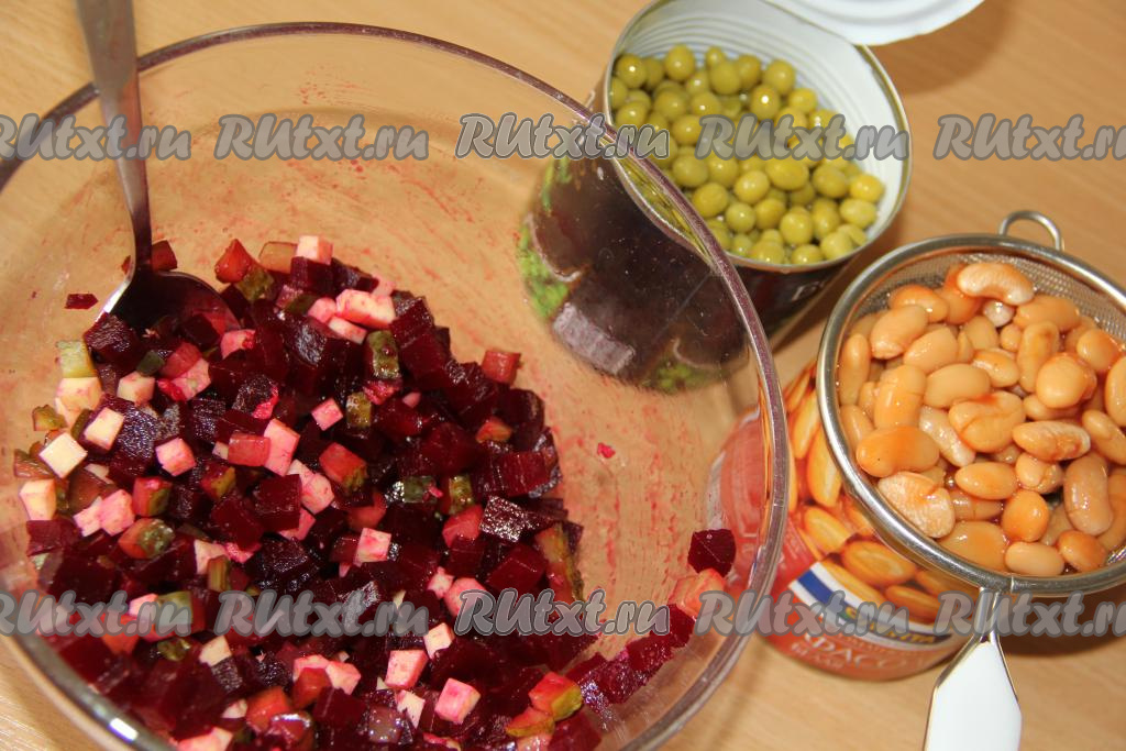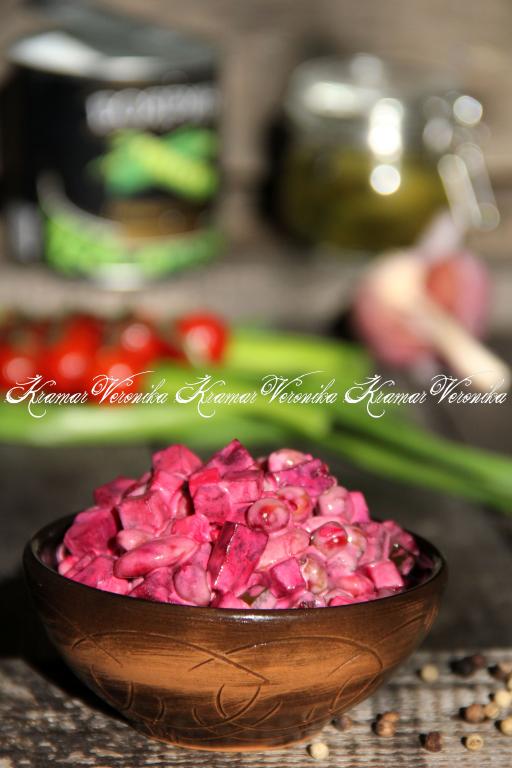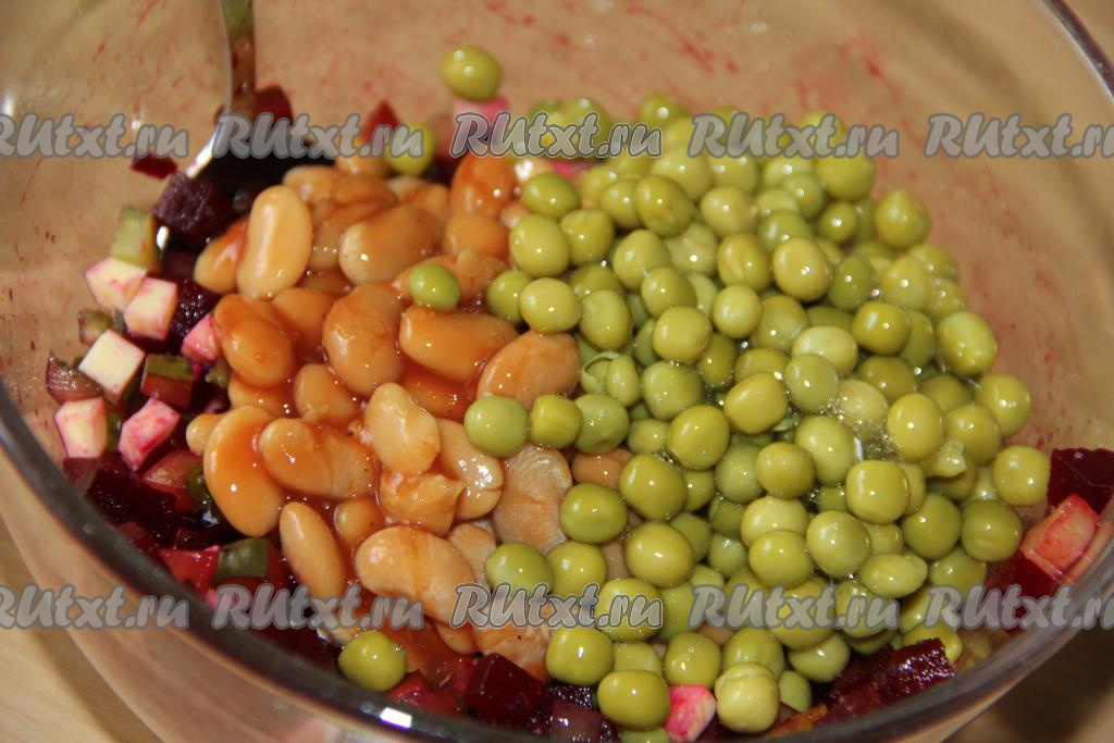 В салат из свеклы, сыра и соленых огурцов добавить консервированные горошек и фасоль (без жидкости), перемешать. Заправлять этот салат майонезом нужно непосредственно перед подачей.
