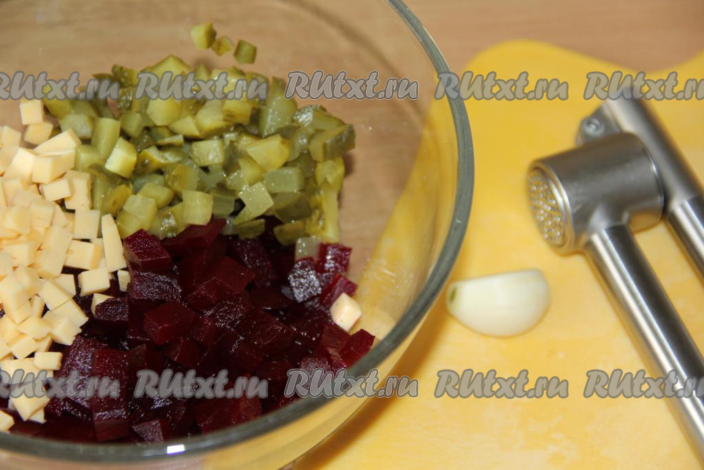 Соединить свеклу, сыр и огурчики, добавить чеснок, пропущенный через пресс.