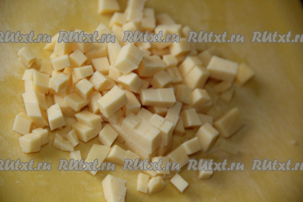 Сыр нарезать на кубики такого же размера, как нарезали свеклу и огурцы.