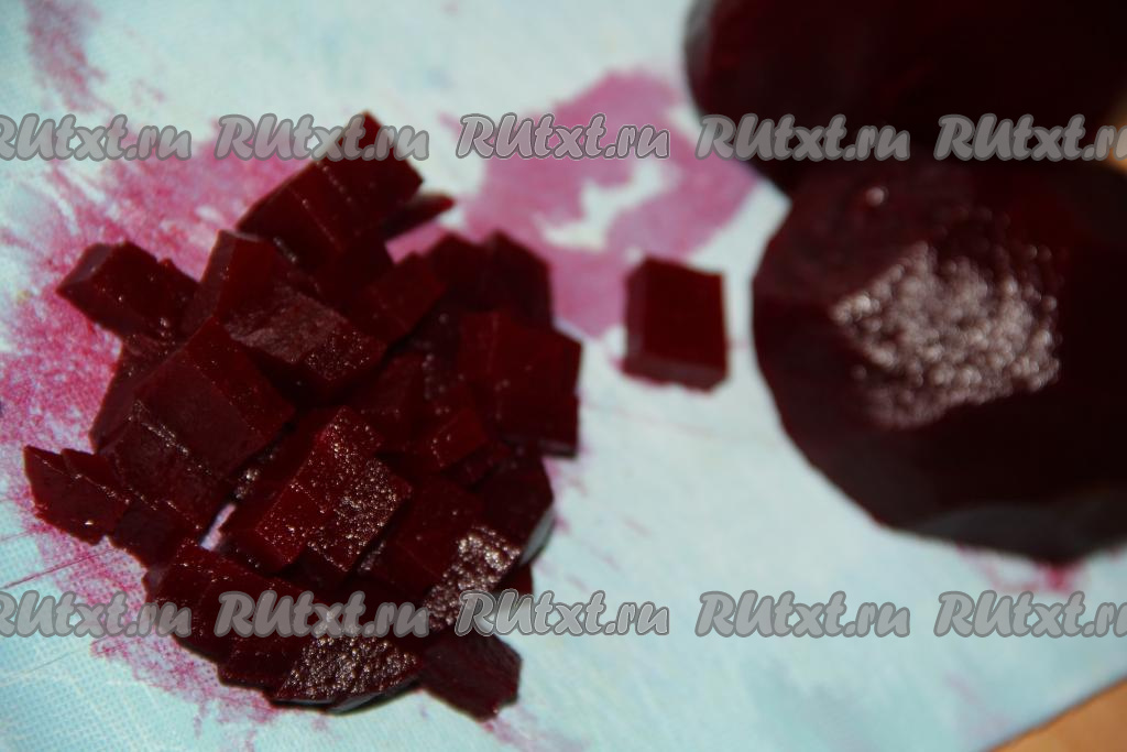 Свеклу предварительно сварить до готовности, остудить, а затем очистить и нарезать на кубики среднего размера.