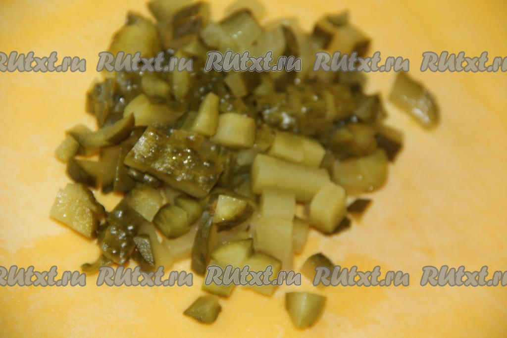Соленые огурчики тоже нарезать на средние кубики.