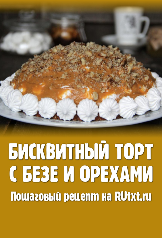 Смазать безе кремом, посыпать орехами и снова выложить слой безе, но уменьшая диаметр торта. Тортик должен получиться "горкой". Смазать безе кремом, посыпать орешками. Поставить бисквитный торт в холодильник на несколько часов.