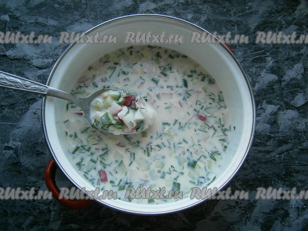 Дать окрошке охладиться в холодильнике хотя бы 1 час.