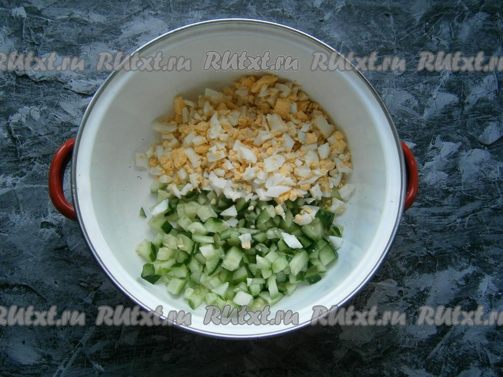 Вареные яйца порубить, добавить нарезанные небольшими кубиками свежие огурцы.