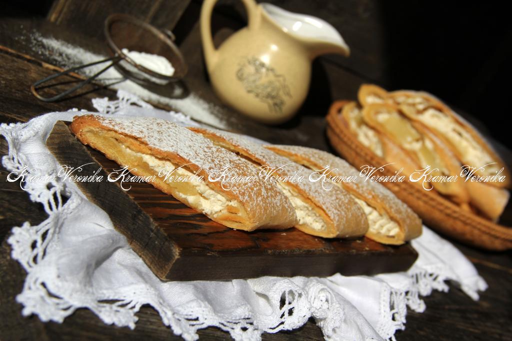 На середину одного пласта выложить часть творога в виде полоски (как на фото).