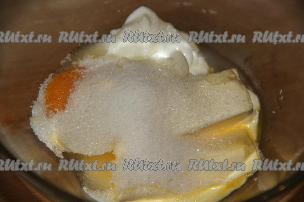 Маргарин, для того чтобы он стал мягким, заранее достать из холодильника и дать полежать при комнатной температуре. Для приготовления теста нужно в глубокой миске соединить мягкий маргарин, желток, сметану, сахар и ванильный сахар.