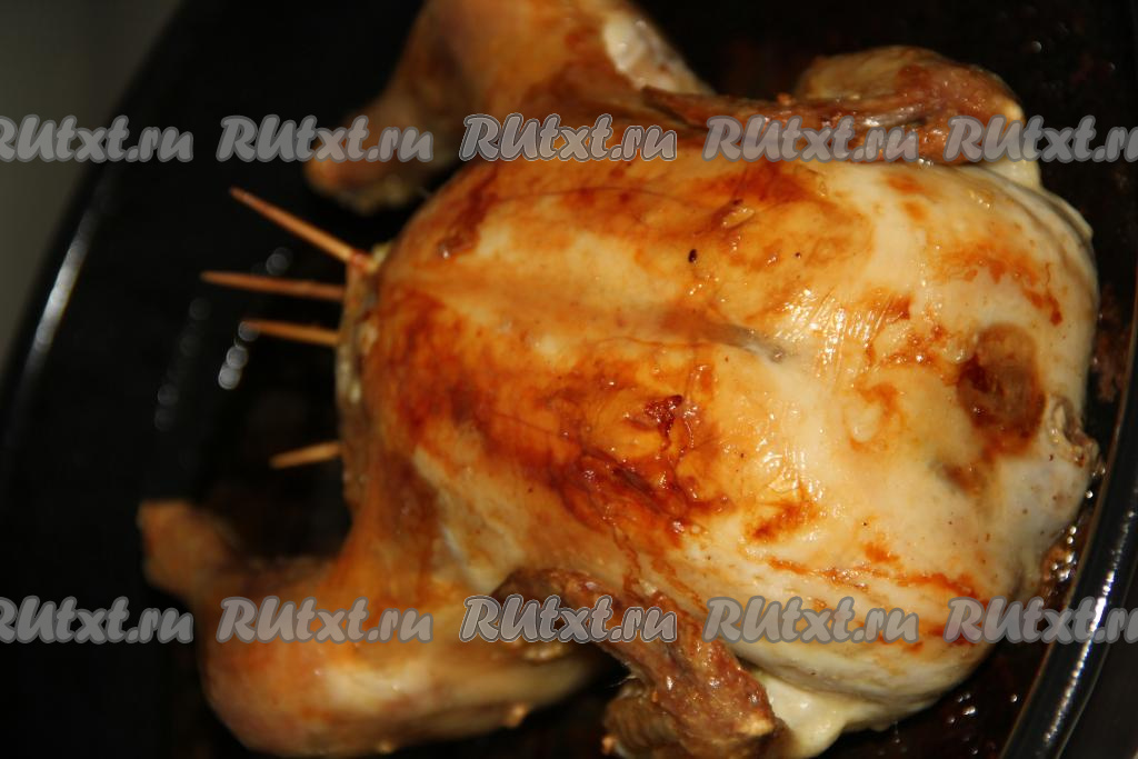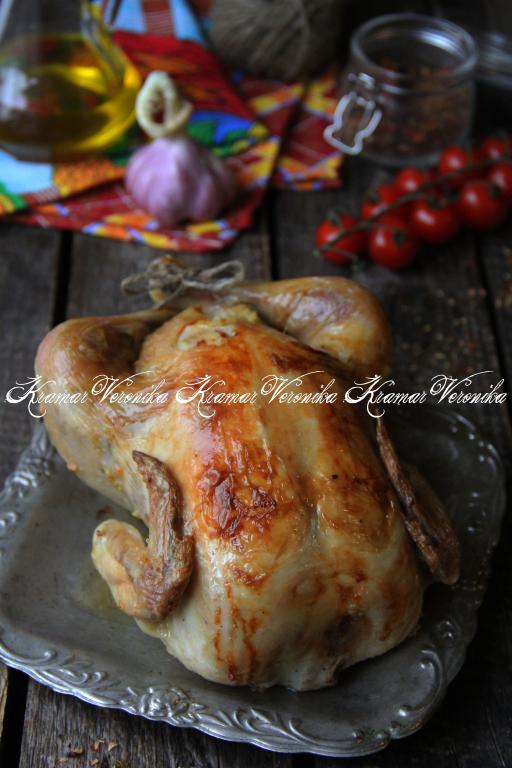 Время приготовления зависит от размера курицы и вашей духовки. Готовность можно проверить, проколов мясо вилкой или ножом (если при прокалывании выделяется прозрачный сок без примесей сукровицы - значит курочка готова).
