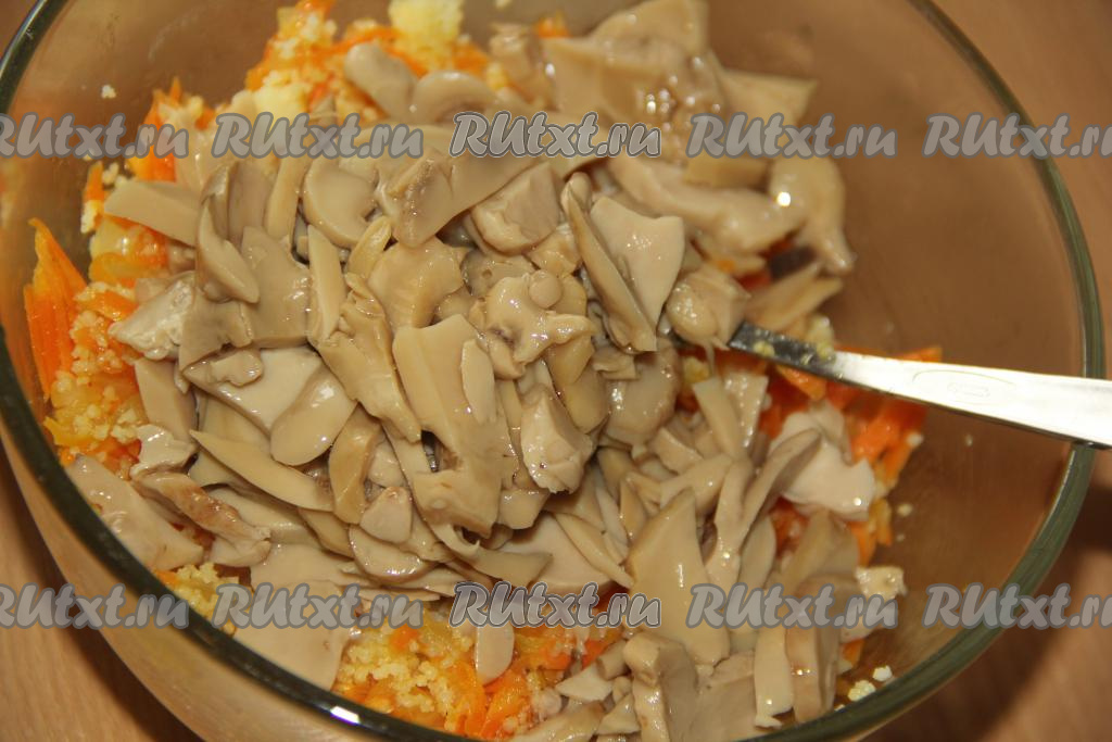 С шампиньонов слить жидкость и добавить к кускусу с овощами, перемешать и начинка для фарширования курицы готова. Если у вас нет грибов, то можно сделать начинку и без них, будет тоже вкусно.