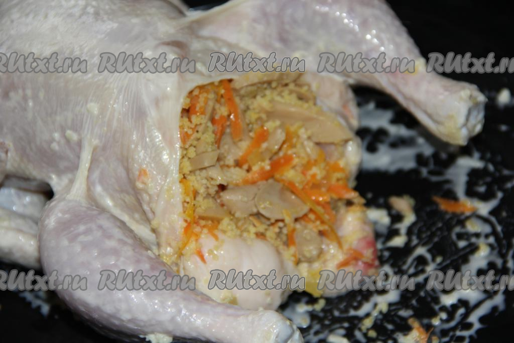 При помощи зубочисток закрыть отверстия в районе шеи и в брюшке курицы. Выложить цыплёнка на противень. На дно противня налить немного воды. Поставить курицу, фаршированную кускусом, в разогретую духовку и запекать 1 час - 1 час 20 минут при температуре 200 градусов.