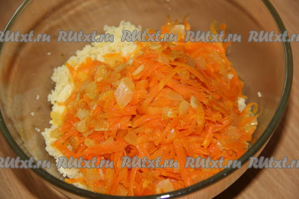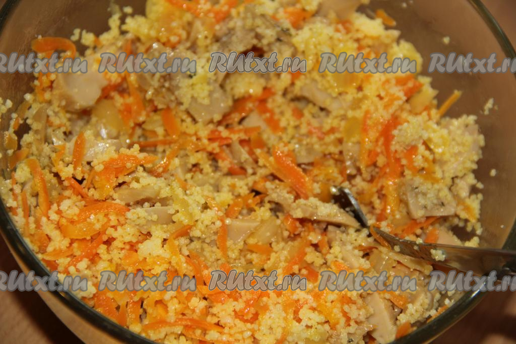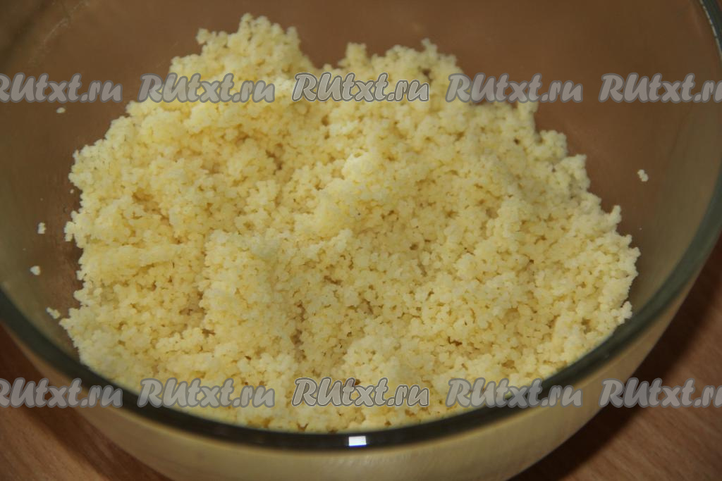 Кускус полностью впитает воду. Переложить крупу в глубокую миску и разрыхлить вилкой.