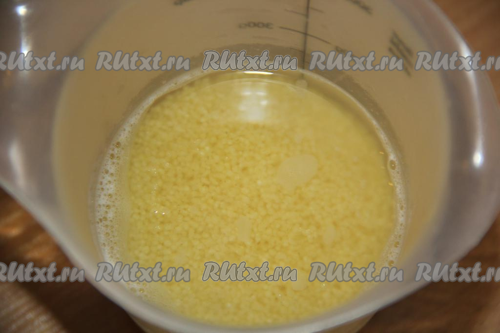 Пока наша курочка маринуется, приготовить кускус. Залить кускус 200 мл крутого кипятка и оставить на 10 минут.