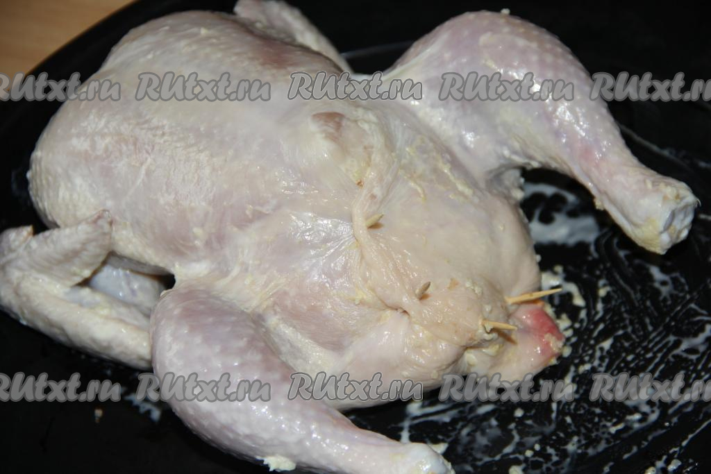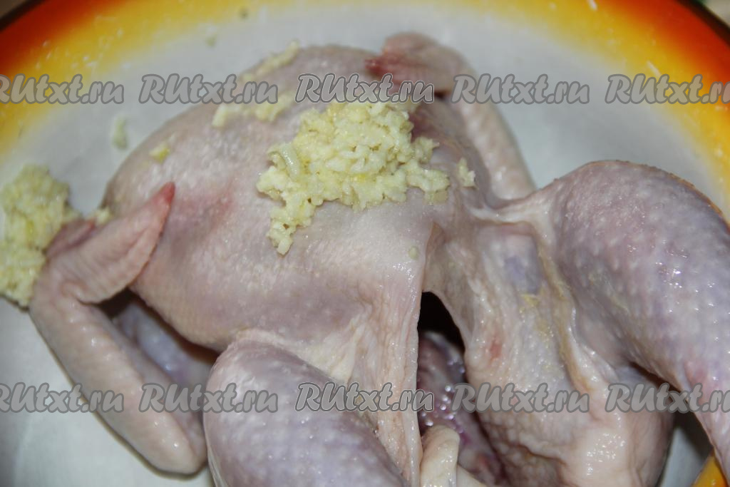 Цыплёнка промыть под проточной водой и обсушить бумажным полотенцем. Чеснок очистить и пропустить через пресс. Хорошо натереть цыплёнка снаружи и внутри чесноком, солью и специями.