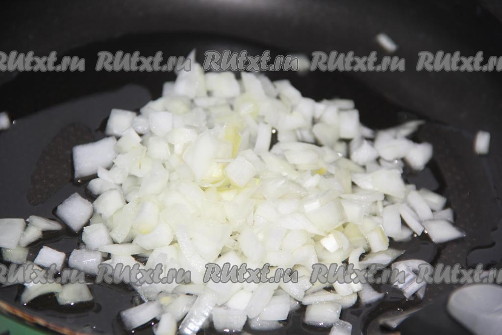 Лук очистить, мелко нарезать, обжарить на растительном масле на среднем огне, помешивая, до золотистого цвета.
