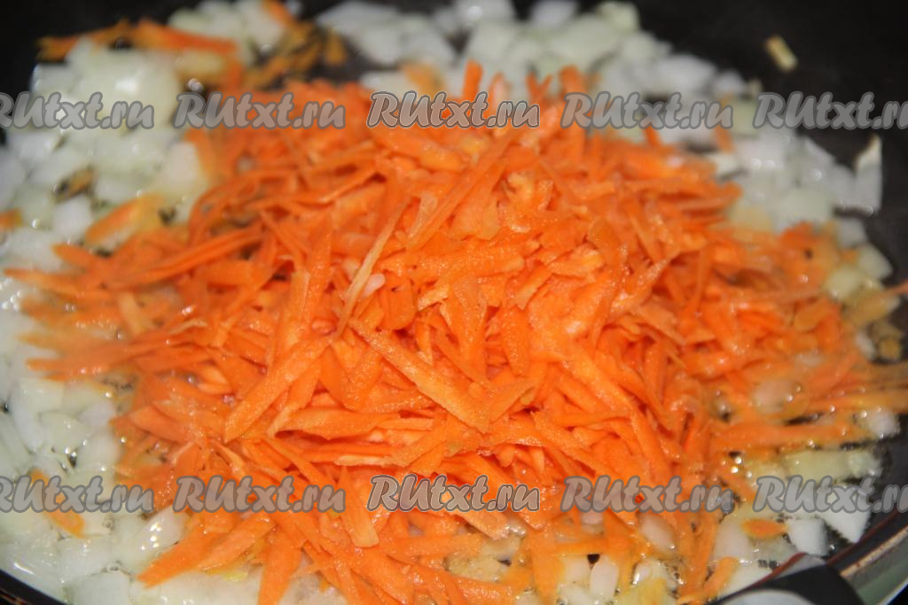 Когда лук станет золотистым, выложить к нему очищенную натёртую морковь, обжарить, периодически перемешивая, в течение 5 минут. Затем снять с огня и дать немного остыть.