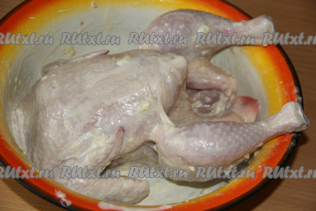 Затем добавить майонез и хорошо обмазать цыплёнка со всех сторон и внутри. Оставить мариноваться на 1 час.