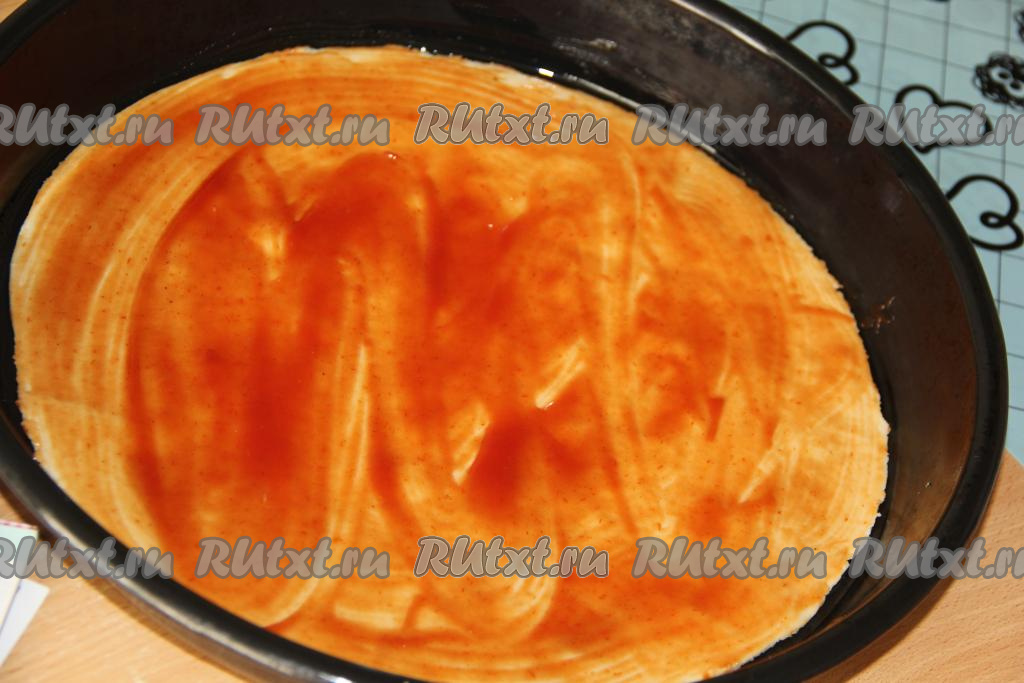 Смазать форму для выпечки растительным маслом, выложить раскатанное тесто, хорошо смазать томатным соусом (или кетчупом).