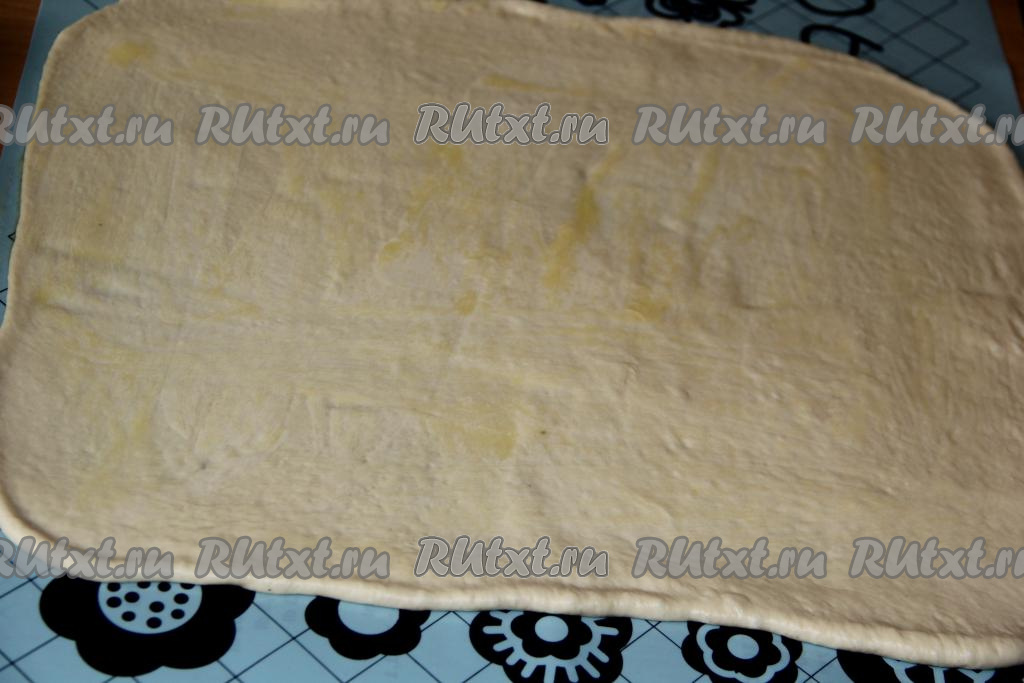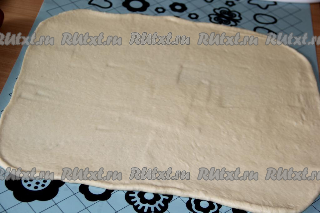 Готовое тесто слегка обмять и разделить на 2 части. Вначале одну часть теста раскатать в прямоугольный пласт.
