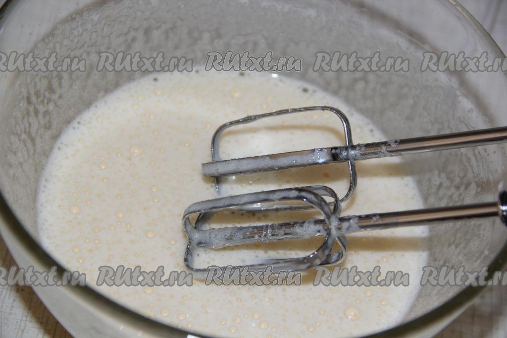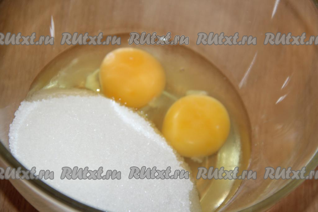 Взбить яйца с сахаром с помощью миксера в течение 5 минут, за это время яичная масса посветлеет и немного увеличится в объёме.