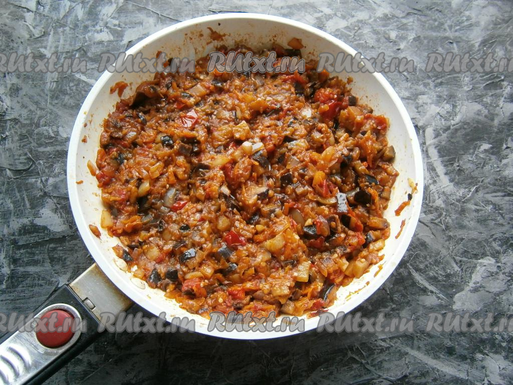 В сковороде разогреть растительное масло, обжарить в нём хорошо отжатые баклажаны в течение 4-5 минут на достаточно сильном огне, периодически перемешивая. Добавить лук с болгарским перцем и натёртую на крупной тёрке морковь.