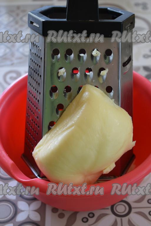 Кладём тесто в миску, накрываем плёнкой и оставляем на расстойку, примерно, на 1 час. В это время займёмся приготовлением начинки. Для этого натрём сыр сулугуни на крупной тёрке.