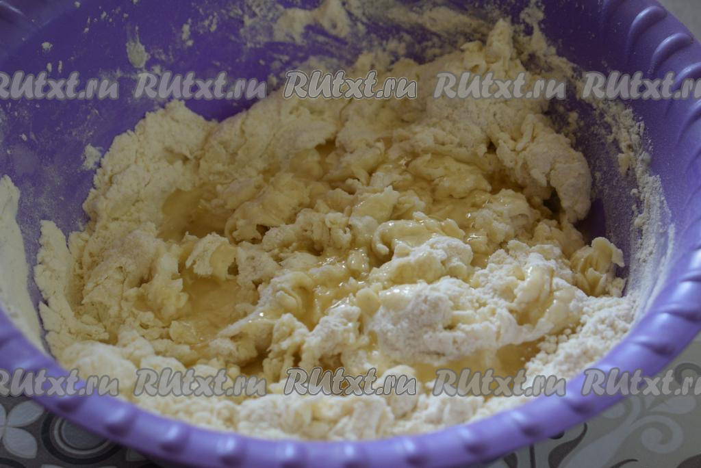 Добавив растительное масло, начнём замешивать тесто, сначала при помощи ложки, а затем руками.