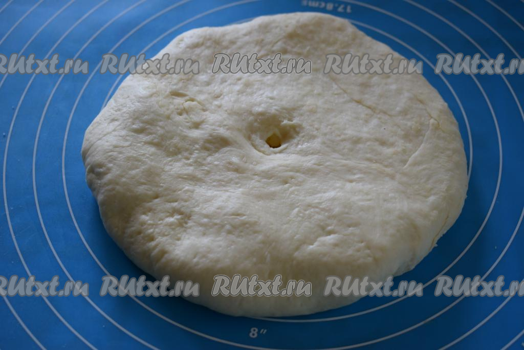 Переворачиваем тесто защипом вниз и аккуратно начинаем расплющивать заготовку по кругу. Диаметр подготовленного хачапури должен получиться, примерно, 20-21 см. Делаем в центре дырочку для выхода пара (протыкаем не насквозь, а только верхний слой теста).