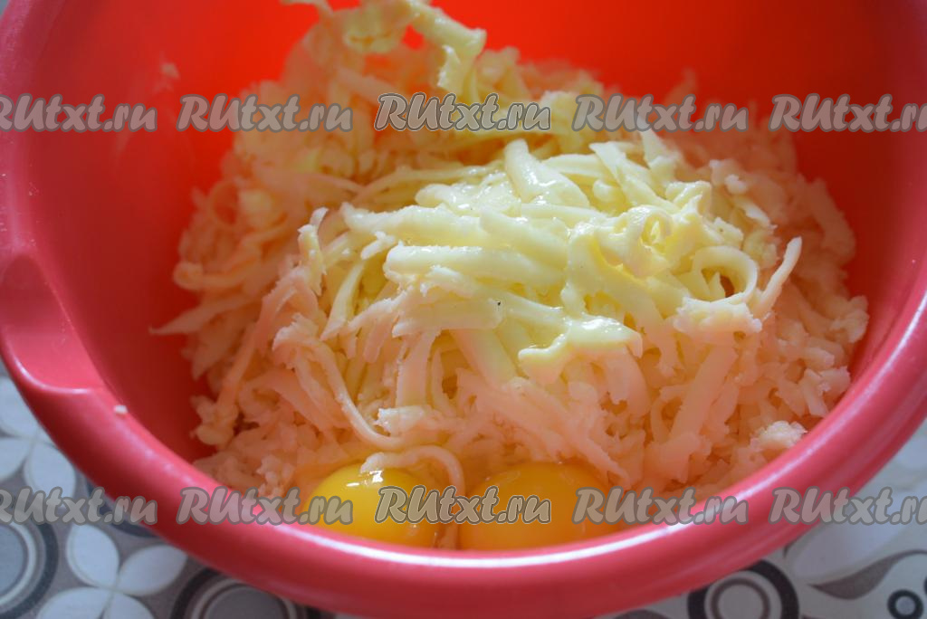 Сливочное масло также натрём на тёрке и добавим к сыру, это придаст сочности начинке. Далее добавляем в начинку одно куриное яйцо (я взяла 2 перепелиных яйца) и перемешиваем до однородности.