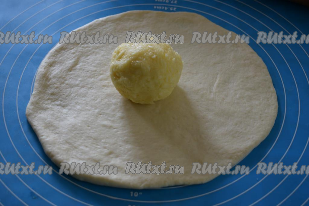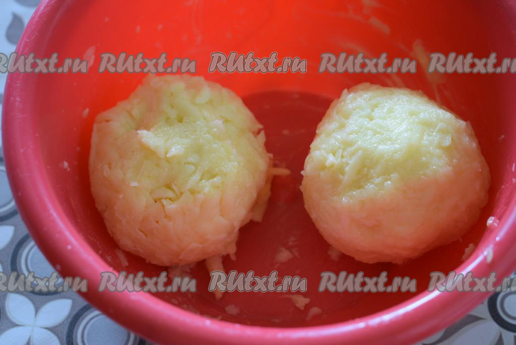 Разделим начинку на 3 равные части и слепим её в шарики. У нас получится 3 сырных шарика-начинки.