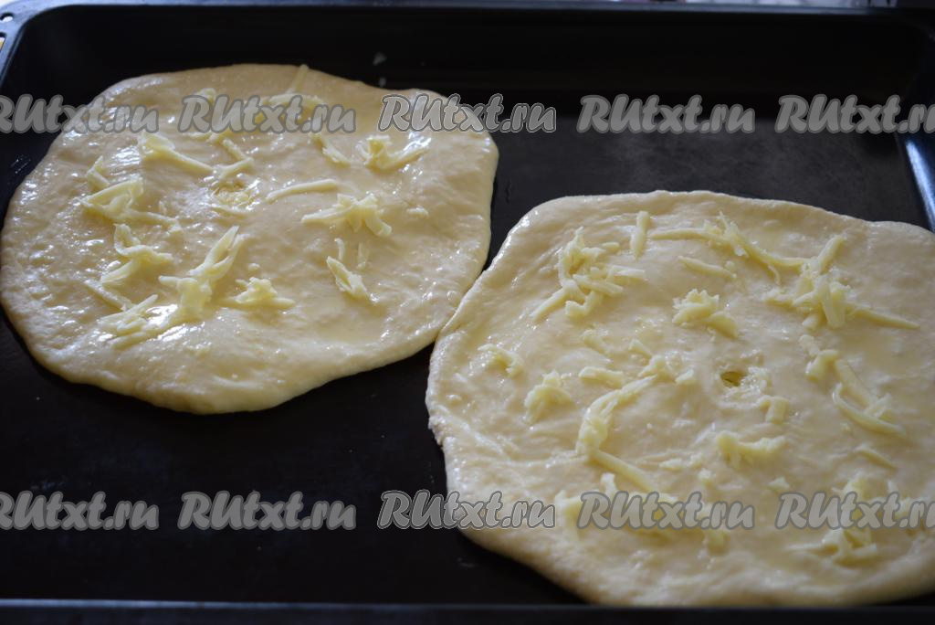 Аналогично лепим оставшиеся лепёшки (в результате у нас получится 3 хачапури с сыром сулугуни) и выкладываем их на противень, смазанный растительным маслом.