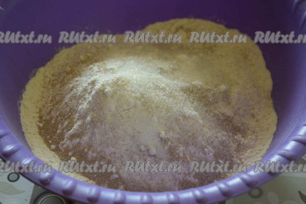 Приготовим дрожжевое тесто для хачапури, для этого в миску насыпем муку, добавим дрожжи, сахар и соль, тщательно перемешаем мучную смесь (до однородности).