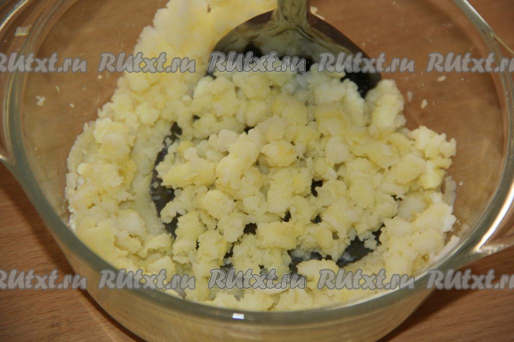 Отварить очищенный картофель в воде до готовности (минут 20-25), затем воду слить, а варёную картошку размять толкушкой.