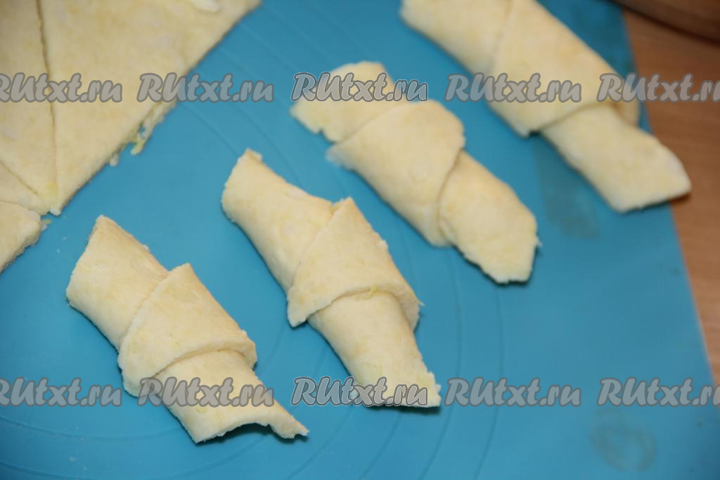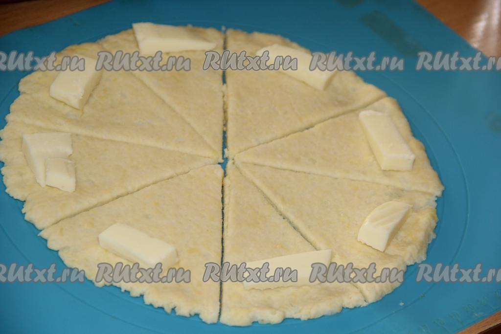 На широкий край каждого сектора положить по кусочку сыра. Начиная заворачивать тесто с широкого края сектора, сформировать рогалики.