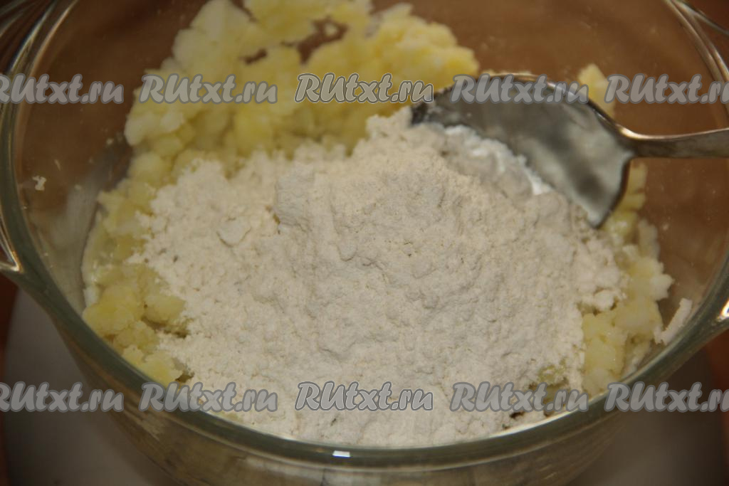 К картофельному пюре добавить муку и соль, перемешать ложкой.