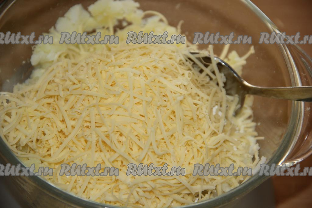 Твёрдый сыр натереть на мелкой тёрке и добавить в картофельную массу.