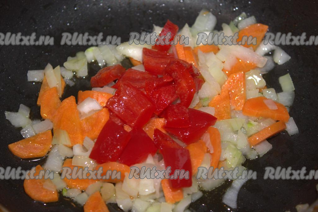 Очистить болгарский перец от семян и перегородок, нарезать на кубики среднего размера. Добавить перец к овощам и обжаривать, помешивая, минуты 3-4.