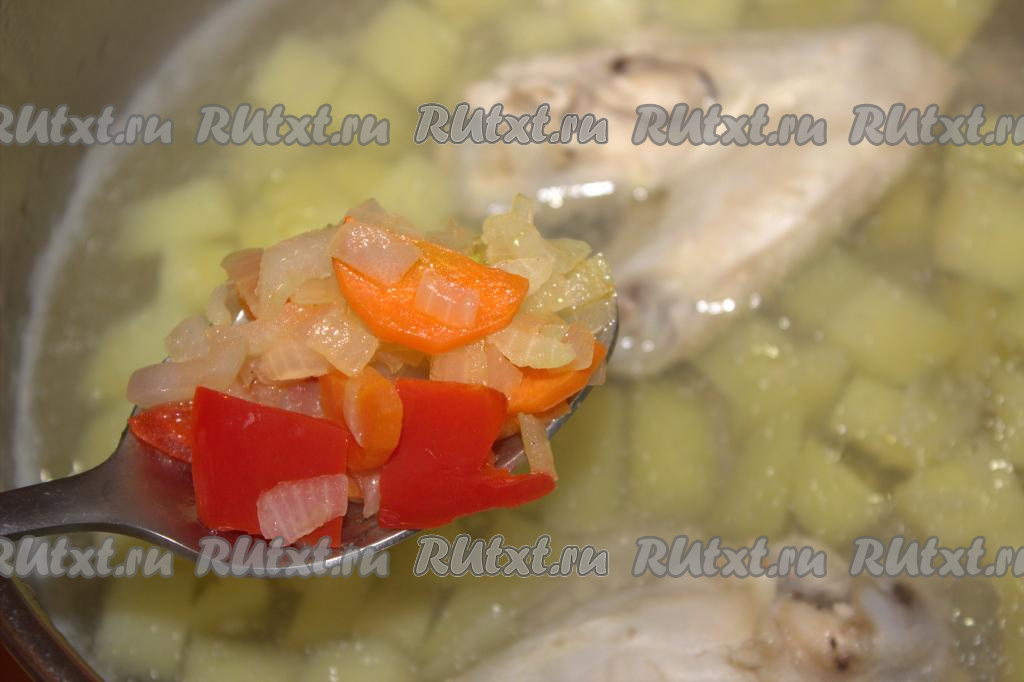 Из супа вынуть кусочки курицы, отделить мясо от костей и вернуть в кастрюлю.